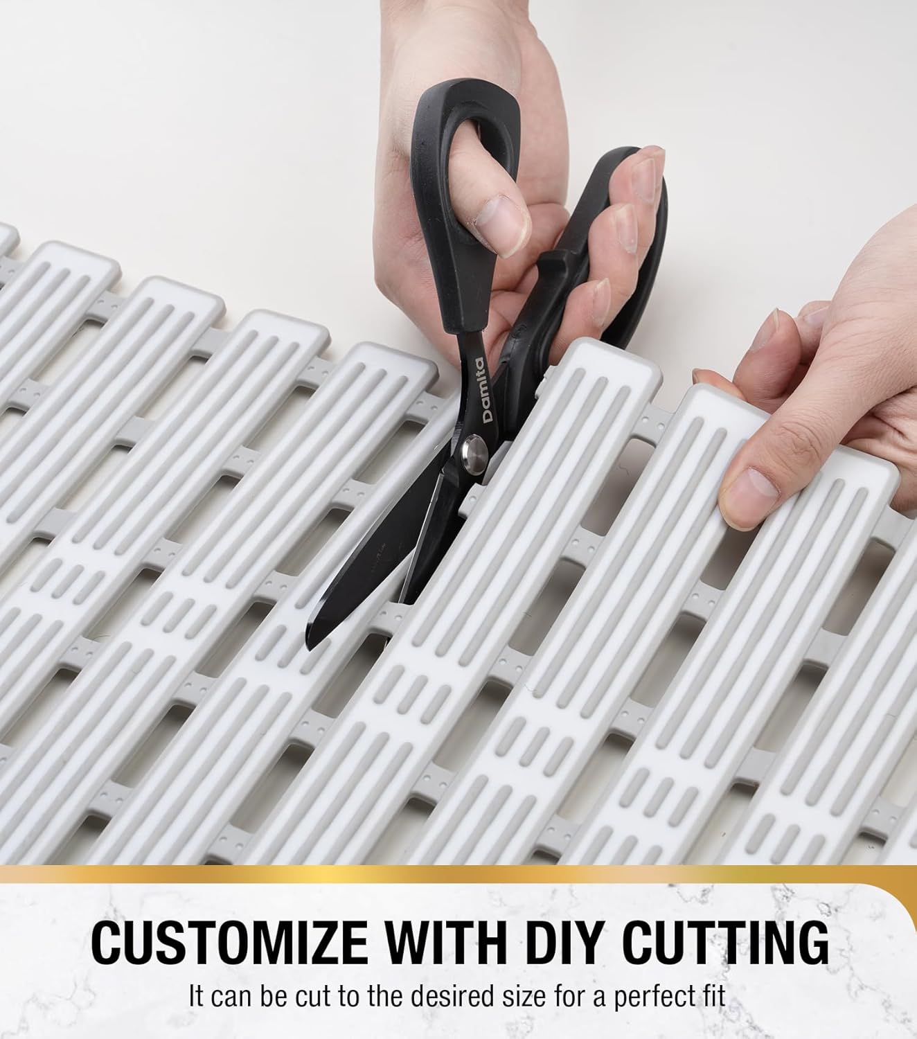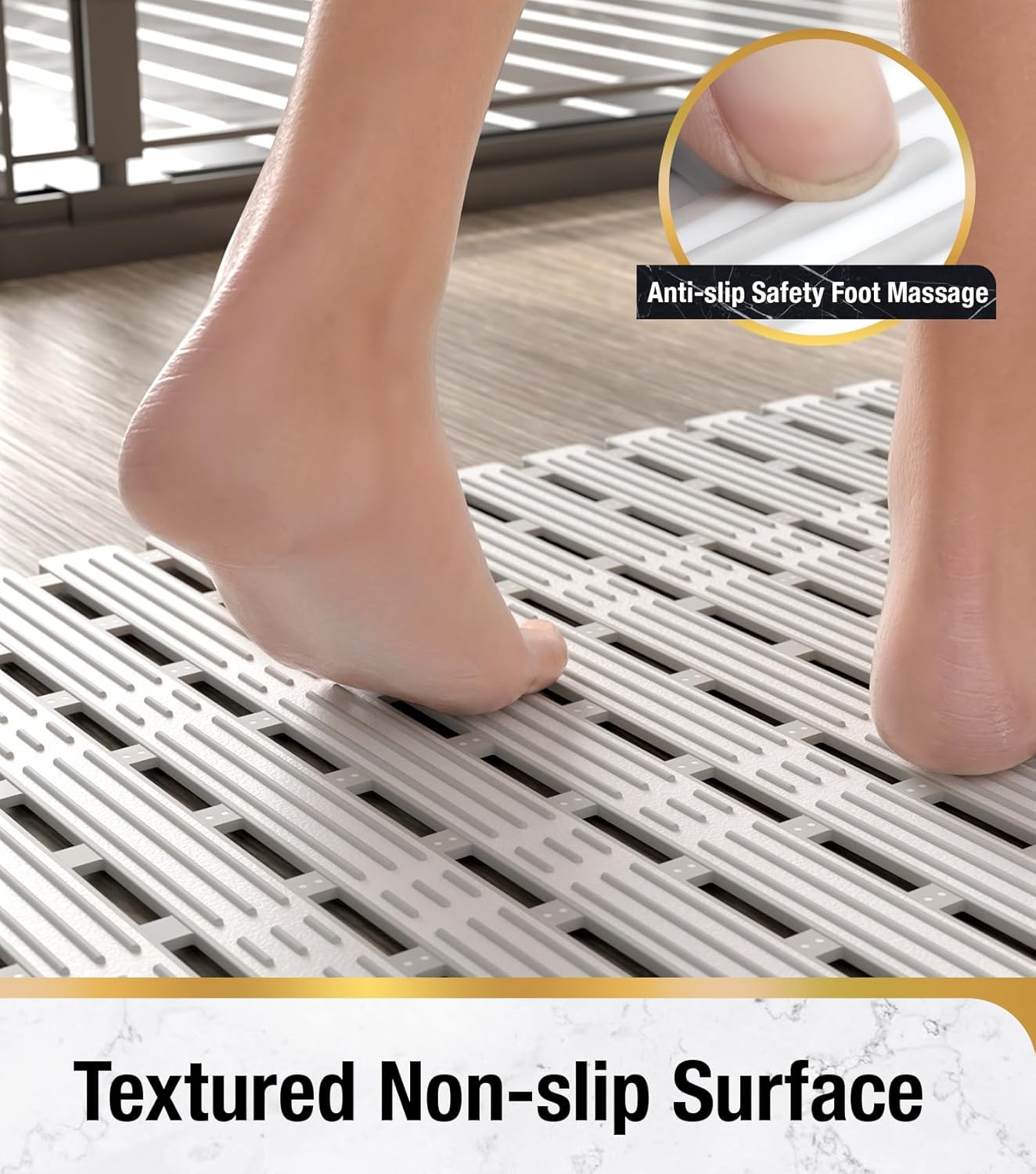 • Effective Drainage Design: This large shower mat features a genius drainage system. Its slotted panels, equipped with numerous drain holes, allow water and soapy residue to flow rapidly. This stops water from pooling under your feet and ensures the tub mat stays clean and ready for your next bath.